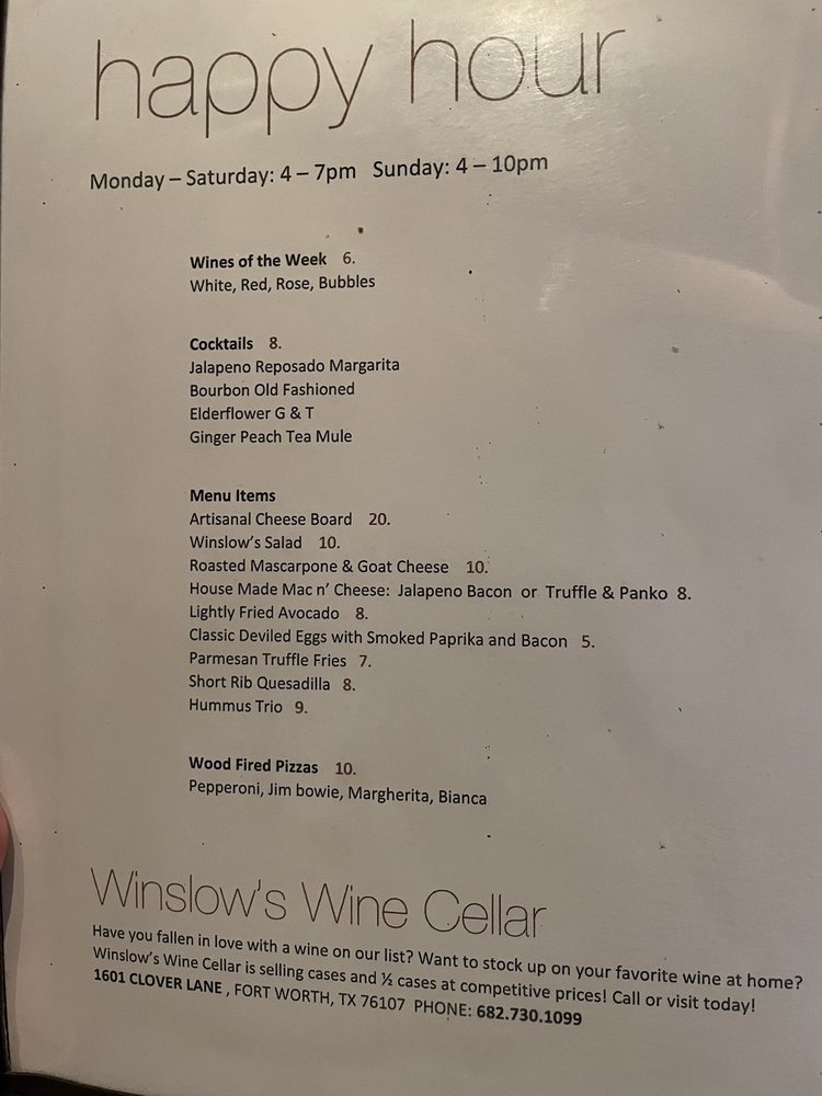 Welcome to Winslow's Wine Cafe, your new favorite spot for New American cuisine, nestled in the heart of Fort Worth. This charming wine bar offers a delightful menu that shines with vibrant flavors and culinary creativity.